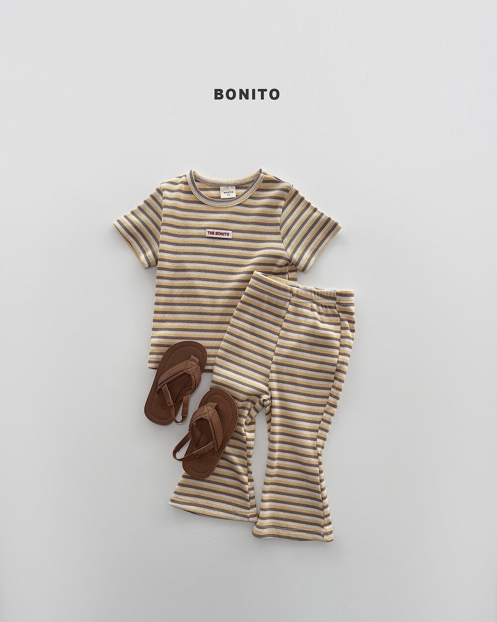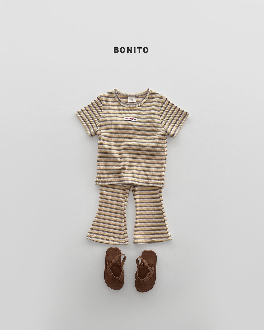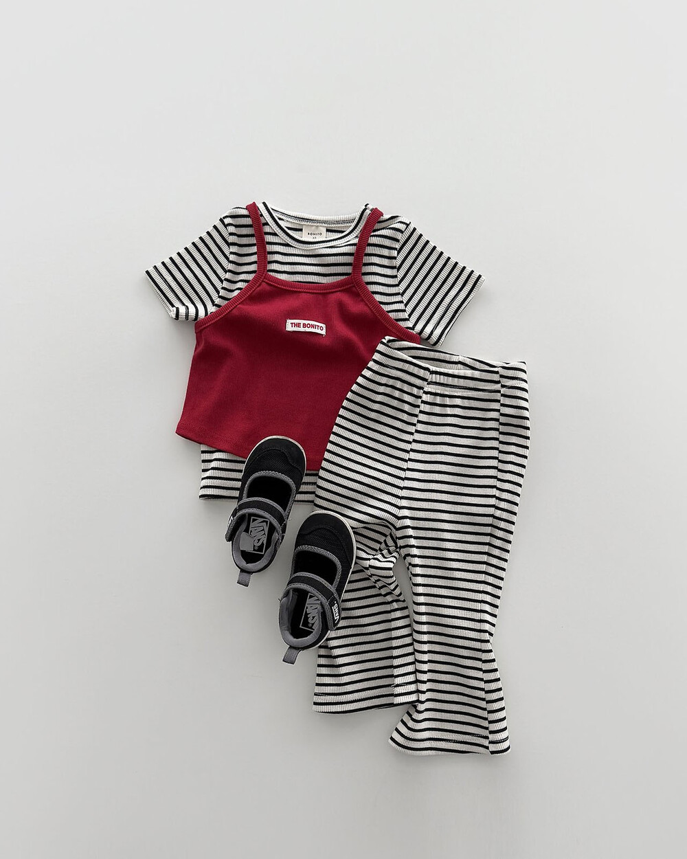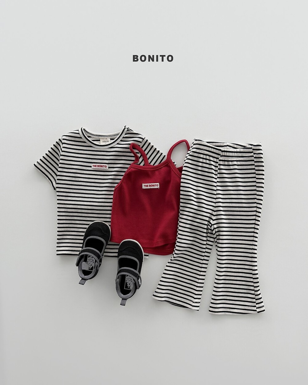 상의는 깔끔한 스트라이프 패턴에 라벨 포인트로 심플한 무드를 더해주고,