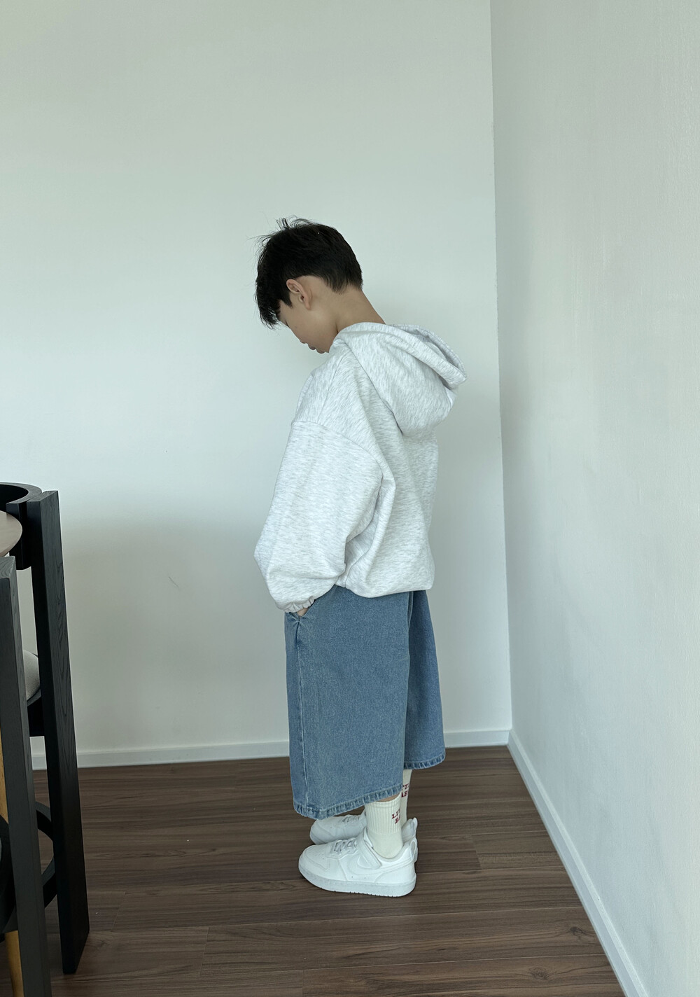 여유 있는 길이감, 핏의 버뮤다 데님 팬츠예요.